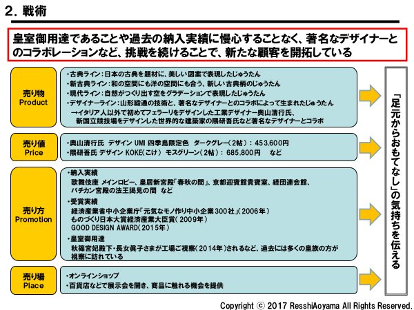皇室御用達であることや過去の納入実績に慢心することなく、著名なデザイナーとのコラボレーションなど、挑戦を続けることで、新たな顧客を開拓しています。